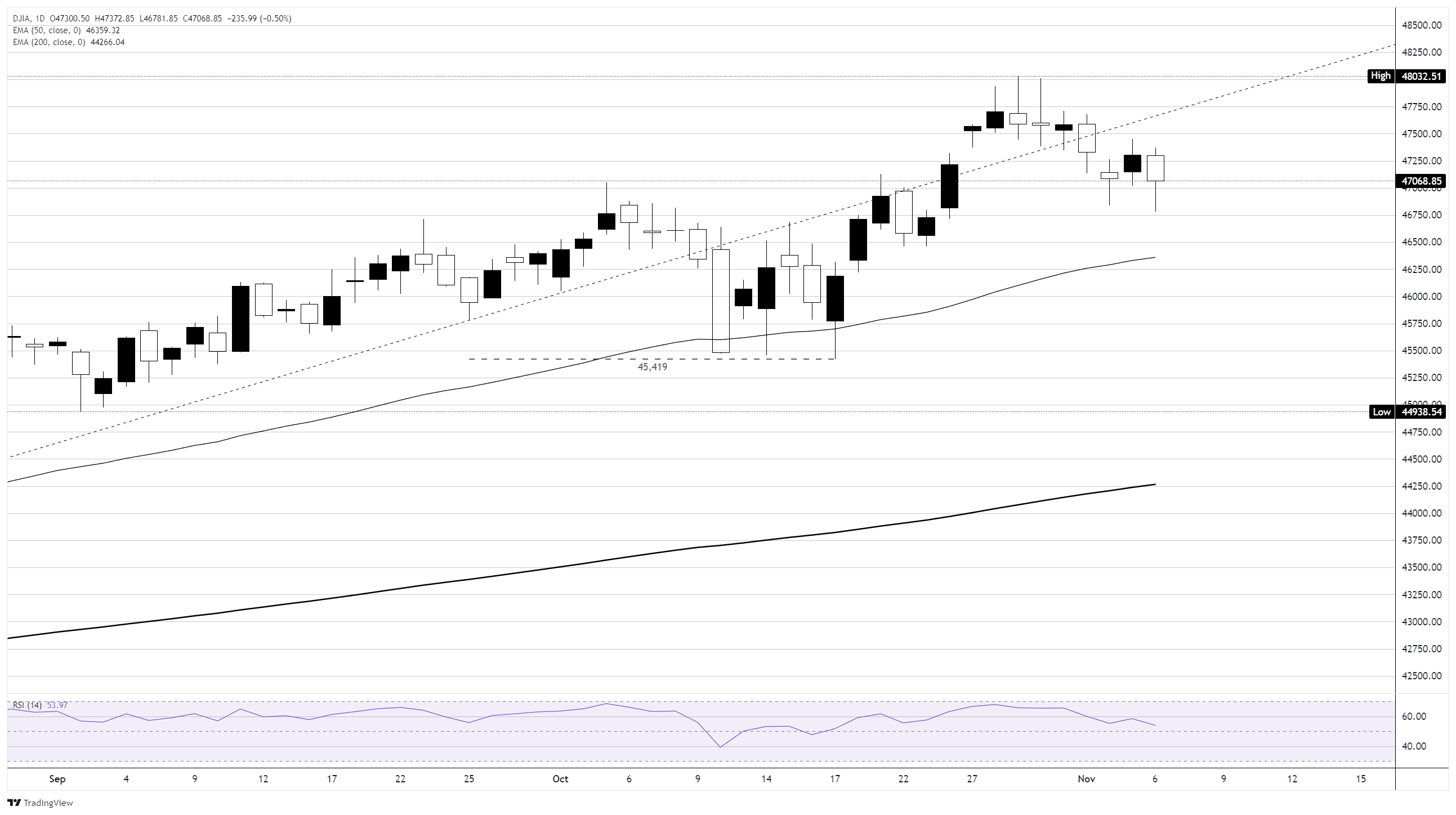 Der Dow Jones testete wieder die 47.000-Marke und fiel um rund 2,6 % von seinem Höchststand, nachdem er Ende Oktober Rekordhöhen knapp über 48.000 erreicht hatte. Ein allgemeiner Rückgang der Technologiewerte wird am Donnerstag nach einem anfänglichen Ausverkauf und einer kurzen Erholung in der Mitte der Woche erneut betrachtet. Salesforce (CRM), Nvidia (NVDA) und Microsoft (MSFT) notieren alle im Minus, während die Anleger beginnen, genauer zu prüfen, ob die extrem hohen Bewertungen und die zukünftigen KGVs, die in Jahrhunderten für Anbieter von Rechenzentrumstechnologie gemessen werden, angesichts der immer noch mythischen Einnahmen aus KI-Projekten weiterhin gerechtfertigt werden können.