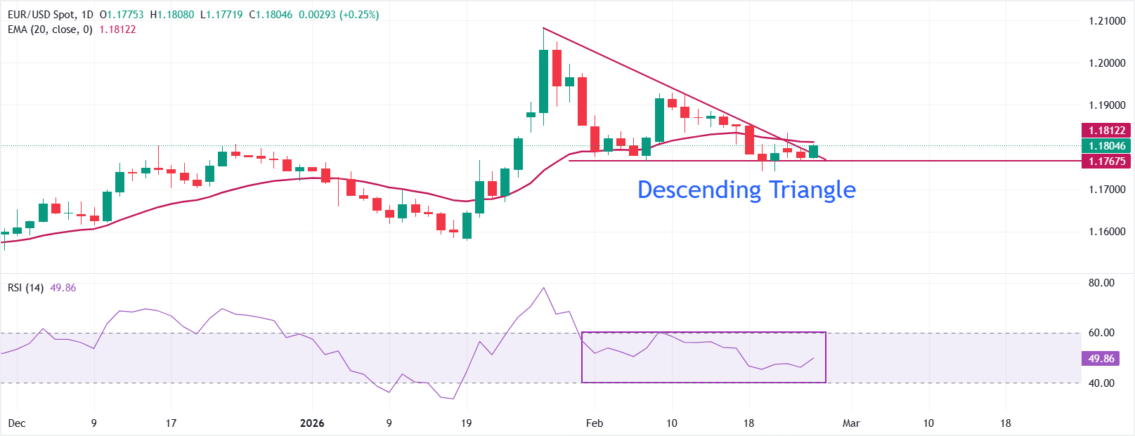 EUR/USD steigt zum Zeitpunkt der Erstellung dieses Berichts auf etwa 1,1805. Der 14-tägige Relative Strength Index (RSI) bewegt sich im Bereich von 40,00-60,00 und spiegelt ausgewogene Bedingungen wider. Der Preis schwankt nahe dem 20-Tage Exponential Moving Average bei 1,1800, was auf einen Seitwärtstrend hinweist.
