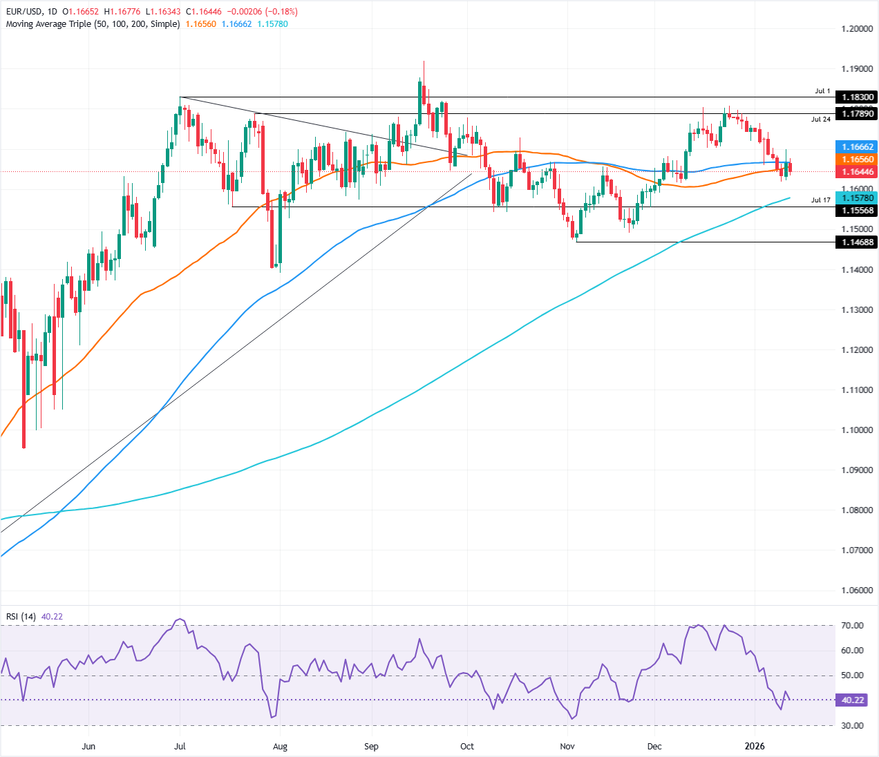 Technische Perspektive: EUR/USD fällt, da Verkäufer drängen und das Paar unter 1,1650 drückt