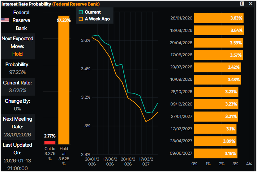 Der Geldmarkt hat die Wahrscheinlichkeit einer Zinssenkung um 25 Basispunkte durch die Fed reduziert, wie das Zinswahrscheinlichkeitswerkzeug von Prime Market Terminal zeigt. Händler sehen den Fed Funds-Zins bisher bei 3,23%, was 52 Basispunkte Zinssenkungen impliziert.