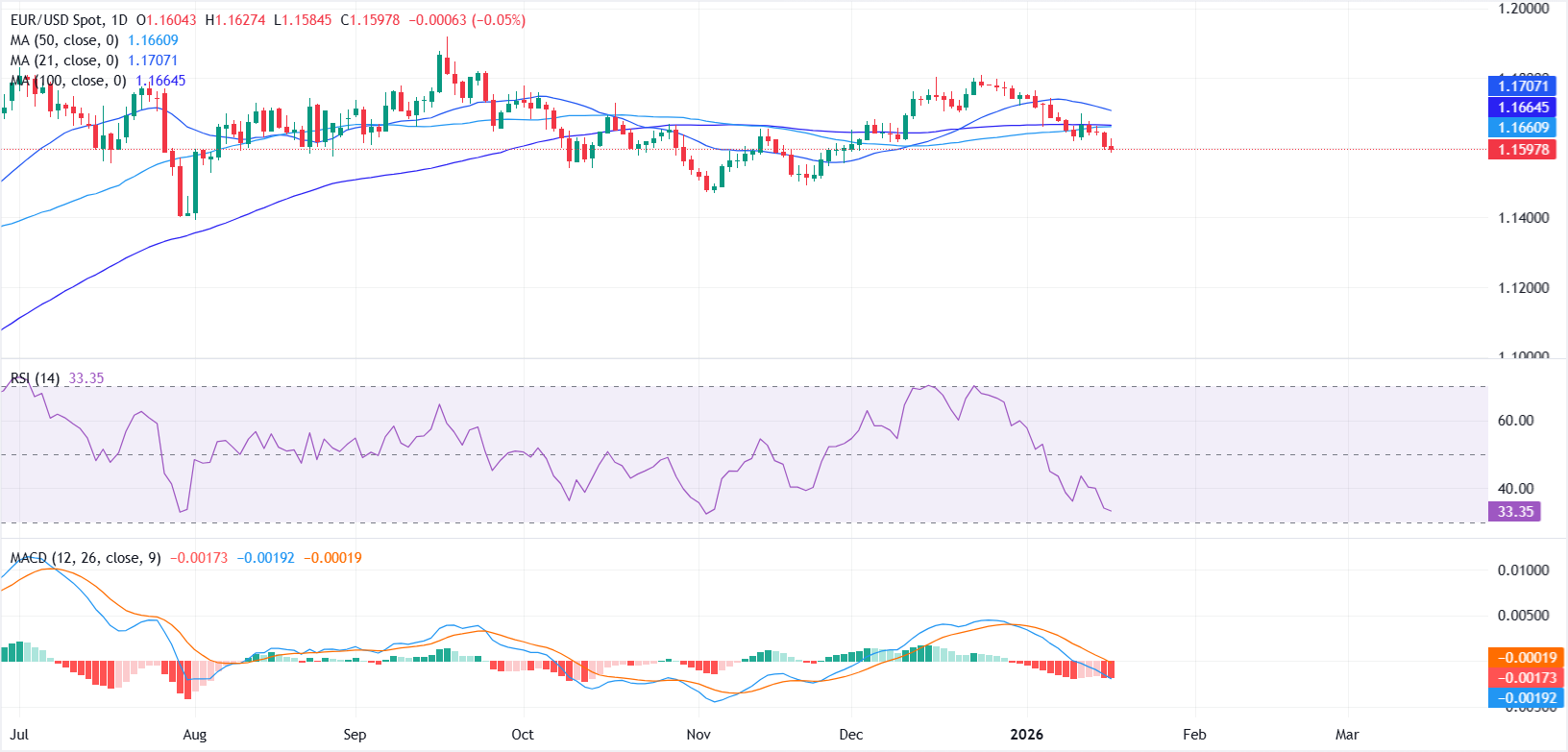 Aus technischer Sicht bleibt EUR/USD unter anhaltendem Verkaufsdruck und fällt unter seine wichtigen gleitenden Durchschnitte auf dem Tages-Chart. Das Paar handelt unter dem 21-Tage-SMA nahe 1,1707 sowie den 50-Tage- und 100-Tage-SMAs, die sich um 1,1660-1,1665 gruppieren, was eine bärische Struktur verstärkt und starken dynamischen Widerstand signalisiert.