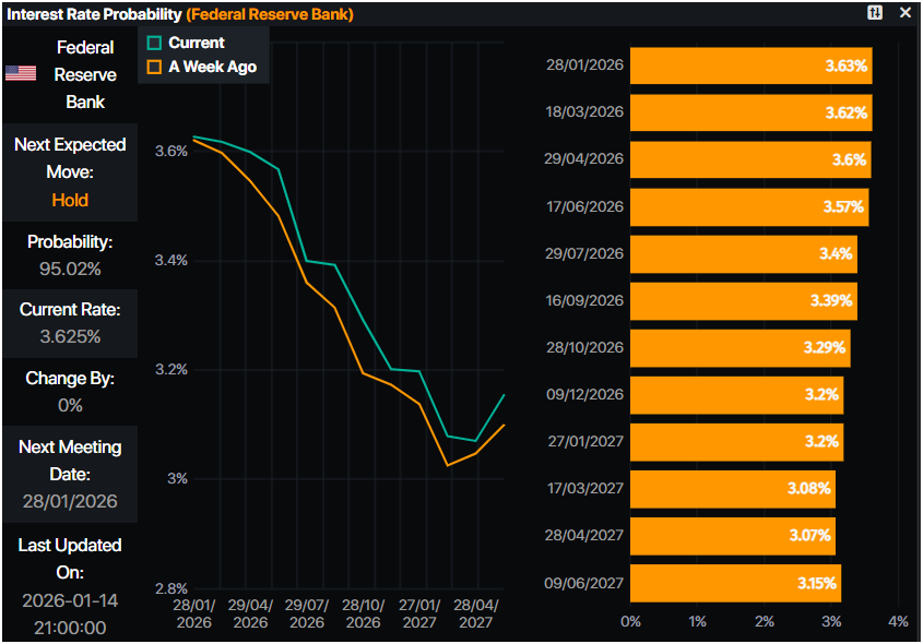 - Der Geldmarkt hat die Chancen auf eine Zinssenkung um 25 Basispunkte durch die Fed verringert, wie das Zinswahrscheinlichkeitswerkzeug von Prime Market Terminal zeigt. Händler sehen den Fed-Funds-Satz bisher bei 3,20%, was 55 Basispunkte an Senkungen impliziert.