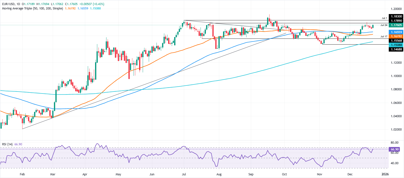 Das technische Bild von EUR/USD deutet darauf hin, dass das Paar sich um 1,1700-1,1750 konsolidiert hat, wobei Käufer zögerlich sind, 1,1800 zurückzuerobern, was die Tür geöffnet hätte, um den Jahres-Höchststand von 1,1918 herauszufordern.