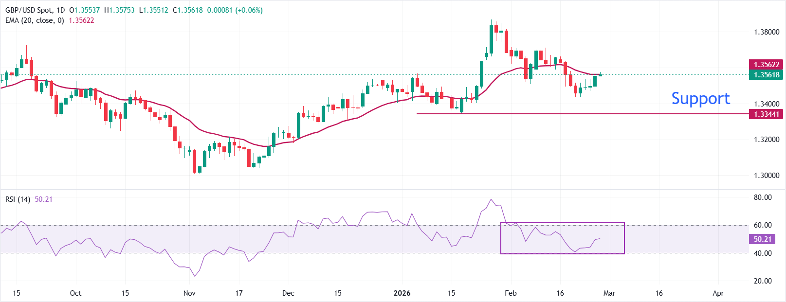 GBP/USD handelt zum Zeitpunkt der Veröffentlichung fest bei etwa 1,3565. Das Paar hält sich um den 20-Tage exponentiell gleitenden Durchschnitt, der bei 1,3562 liegt und die Richtungssicherheit begrenzt.
