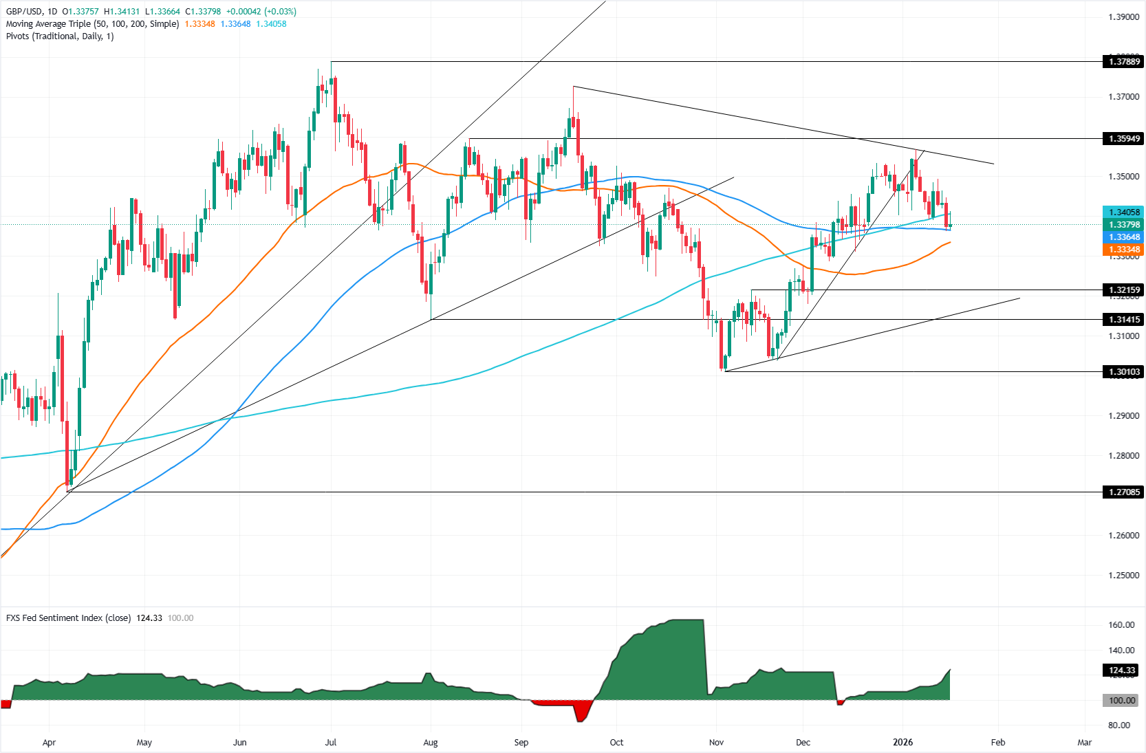 Kurzfristig hat GBP/USD bärisch gedreht, nachdem eine Unterstützungstrendlinie, die von den Tiefstständen Ende November gezeichnet wurde, am 6. Januar durchbrochen wurde. Seitdem konsolidierte sich das Paar kurz über dem 200-Tage-SMA bei 1,3405, bevor es unter diesen auf neue Jahrestiefststände von 1,3366 fiel.