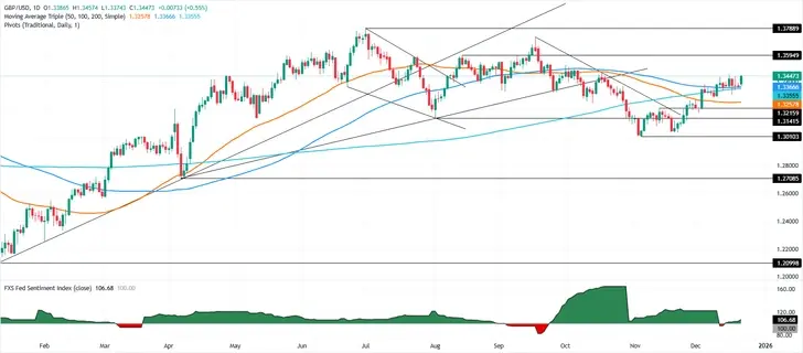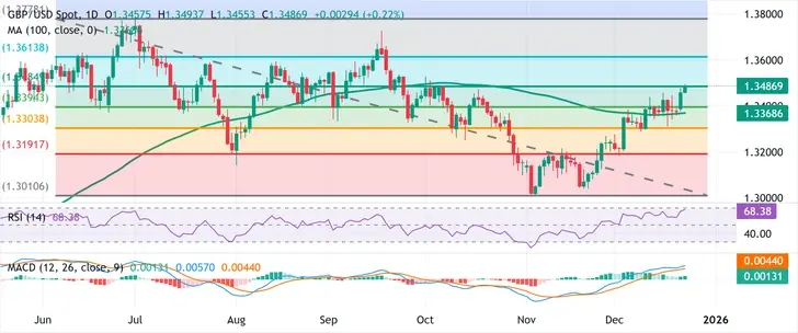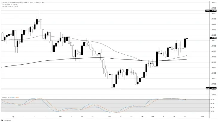 GBP/USD steigt während der nordamerikanischen Sitzung am Montag um 0,59%, nachdem die neuesten Daten aus dem Vereinigten Königreich (UK) zeigten, dass die Wirtschaft wie erwartet wuchs, während die Liquidität dünn war, da die Anleger sich auf den Feiertag am Heiligabend vorbereiten. Zum Zeitpunkt des Schreibens handelt das Paar bei 1,3450, nachdem es von einem Tages-Tief von 1,3374 zurückgeprallt ist.