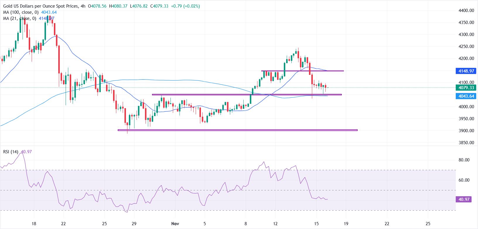Der kurzfristige Ausblick für Gold scheint range-bound zu sein, wobei das 4-Stunden-Diagramm wiederholt Unterstützung um den 100-periodischen SMA bei etwa 4.043 USD zeigt. Dieses Niveau stimmt auch eng mit der oberen Grenze der vorherigen Konsolidierungszone überein, was seine Bedeutung als starke Unterstützungszone verstärkt.
