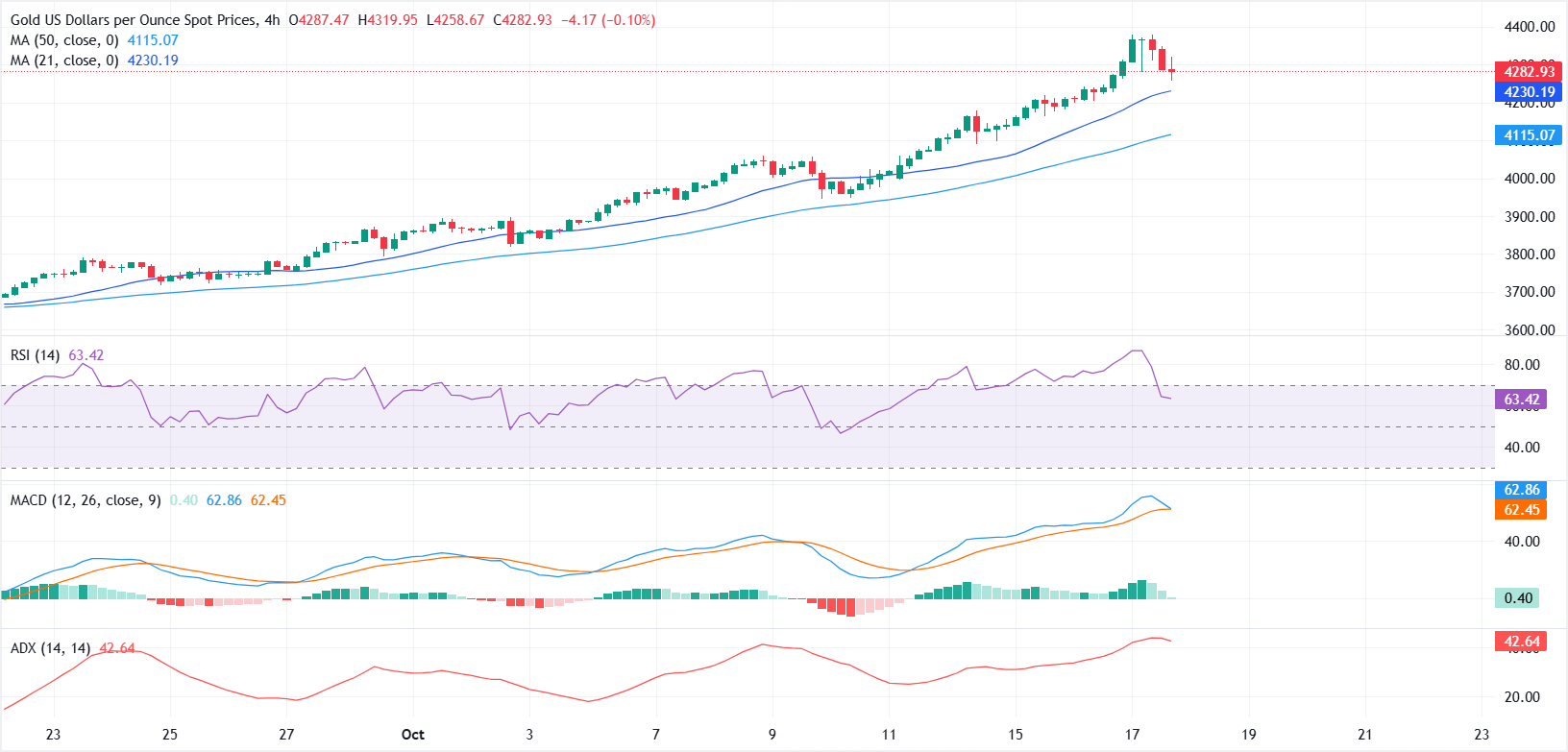Auf dem 4-Stunden-Chart liegt die unmittelbare Unterstützung am 21-Perioden Simple Moving Average (SMA) nahe 4.230 USD, gefolgt vom 50-SMA bei etwa 4.115 USD. Der Relative Strength Index (RSI) ist auf etwa 64 zurückgegangen und hat sich aus dem überkauften Bereich zurückgezogen, was den Preisen ermöglichen könnte, sich zu konsolidieren, bevor der nächste Anstieg erfolgt.