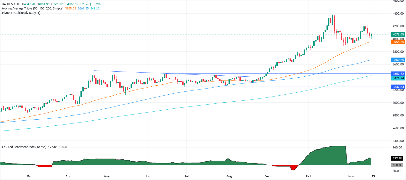 Ein Versagen, Gewinne über 4.050 USD zu halten, würde XAU/USD jedoch anfällig für einen Rückgang in Richtung 4.000 USD machen, gefolgt von einem möglichen Test des Tiefs vom 28. Oktober nahe 3.886 USD.
