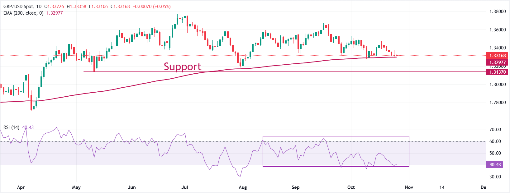 Das Pfund Sterling hat Schwierigkeiten, gegenüber dem US-Dollar in der Nähe des 12-Tage-Tiefs um 1,3310 am Montag Boden zu gewinnen. Der allgemeine Trend des GBP/USD-Paares ist ungewiss, da es in der Nähe des 200-Tage-Exponential Moving Average (EMA) schwankt, der bei etwa 1,3300 gehandelt wird.