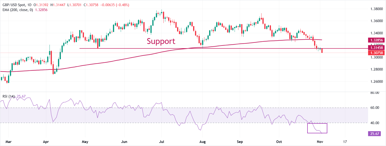 Das Pfund Sterling setzt seinen Rückgang unter 1,3100 gegenüber dem US-Dollar während der europäischen Sitzung am Dienstag fort. Der Ausblick für das Währungspaar bleibt bärisch, da es unter dem 200-Tage-Exponential Moving Average (EMA) handelt, der bei etwa 1,3279 liegt.