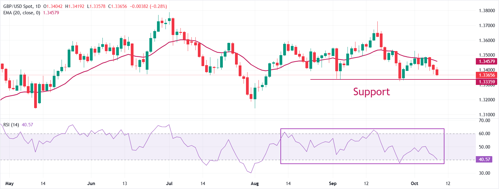 Das Pfund Sterling fällt am Donnerstag auf etwa 1,3365 gegenüber dem US-Dollar, dem niedrigsten Stand seit 10 Tagen. Der kurzfristige Trend des GBP/USD-Paares bleibt bärisch, da es unter dem 20-Tage-Exponential Moving Average (EMA) bleibt, der bei etwa 1,3458 handelt.