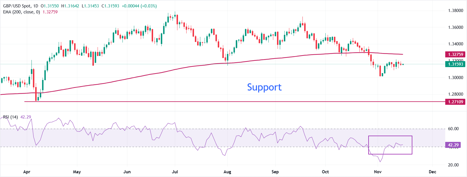Das Pfund Sterling wird zum Zeitpunkt der Erstellung dieses Berichts innerhalb der Handelsspanne vom Montag um 1,3160 gegenüber dem US-Dollar gehandelt. Der allgemeine Trend des Paares bleibt bärisch, da es unter dem 200-Tage-Exponential Moving Average (EMA) handelt, der bei etwa 1,3276 liegt.