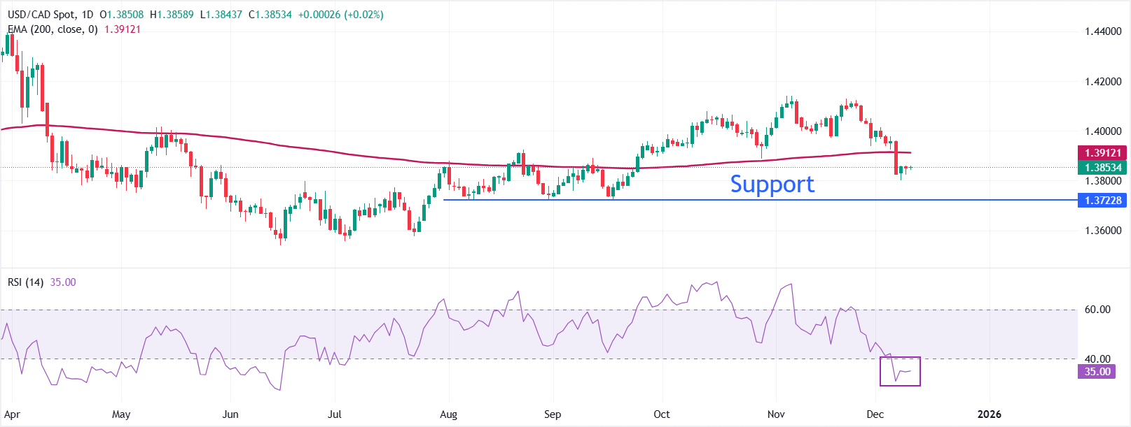 Unterhalb des 200-Tage-EMA bleibt der Weg des geringsten Widerstands nach unten, wobei Aufwärtsbewegungen durch diese dynamische Barriere begrenzt werden. Ein täglicher Schlusskurs über dem Durchschnitt würde den unmittelbaren bärischen Ton neutralisieren und die Tür für eine breitere Erholung in Richtung des Hochs vom 4. Dezember bei 1,3977 öffnen. Der RSI müsste 50 zurückerobern, um eine Verbesserung des Momentums zu validieren. Auf der Unterseite bleibt das Tief vom 7. August bei 1,3720 ein wichtiger Nachfragestandort.