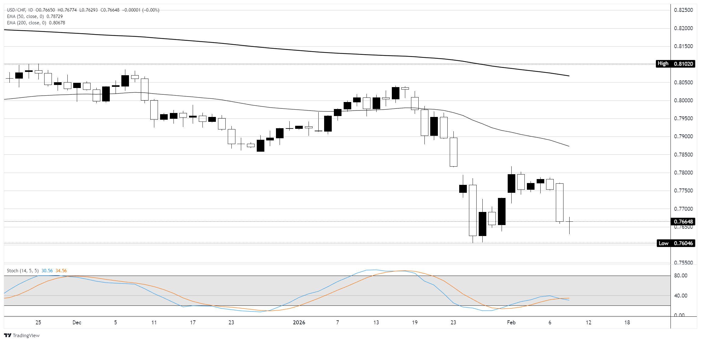 In den kürzeren Zeitrahmen fiel USD/CHF am 10. Februar auf 0,7629, bevor es sich wieder erholte und nahe 0,7665 schloss, was einen Test und eine Ablehnung des Bereichs 0,7650 zeigt, der als Pivot durch die Preisbewegungen Ende Januar und Anfang Februar fungierte. Der Stochastische Oszillator (14, 5, 5) zeigt 30,56/34,56, schwebt gerade über dem überverkauften Bereich und zeigt noch keinen klaren bullischen Kreuzungspunkt, was darauf hindeutet, dass das Abwärtsmomentum weiterhin die Oberhand hat. Ein nachhaltiger Bruch unter 0,7600 würde die Tür zum projizierten Ziel bei 0,7382 öffnen, das aus der gemessenen Bewegung des größeren Rückgangs von den Höchstständen 2022 abgeleitet ist. Auf der Aufwärtsseite sieht sich jeder Erholungsversuch geschichteten Widerständen bei 0,7790 (ehemalige Unterstützung, die zu Widerstand wurde) und dem 50 EMA nahe 0,7873 gegenüber. Die Daten zum Schweizer Verbraucherpreisindex (VPI), die am 13. Februar veröffentlicht werden, könnten frische Volatilität einbringen, während die Schweizerische Nationalbank (SNB) die Inflation genau beobachtet, nachdem Vorsitzender Schlegel potenzielle Interventionen am Devisenmarkt zur Steuerung der Frankenstärke angedeutet hat.