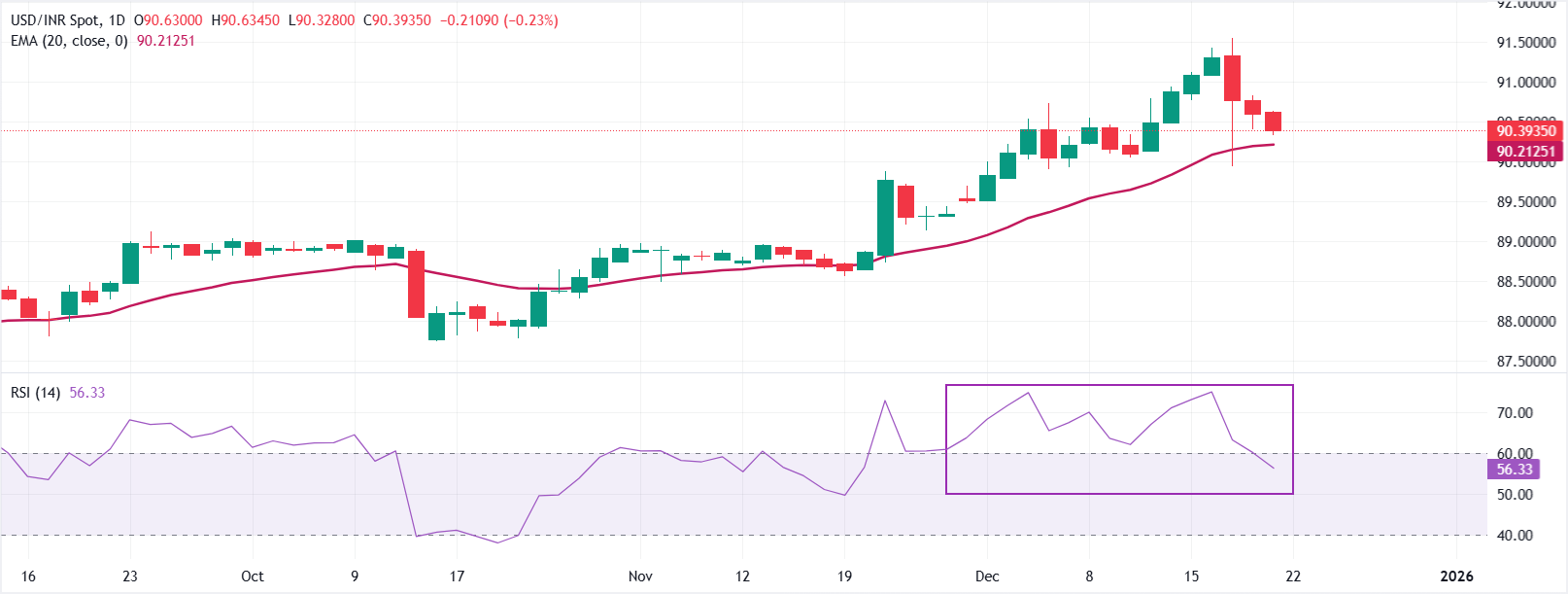 Im Tageschart handelt USD/INR bei 90,3935. Der Preis hält sich über dem steigenden 20-Tage exponentiellen gleitenden Durchschnitt (EMA) bei 90,2125 und bewahrt eine Aufwärtsneigung. Die positive Steigung des Durchschnitts führt den Preis weiterhin nach oben und hat die jüngsten Rückgänge absorbiert.