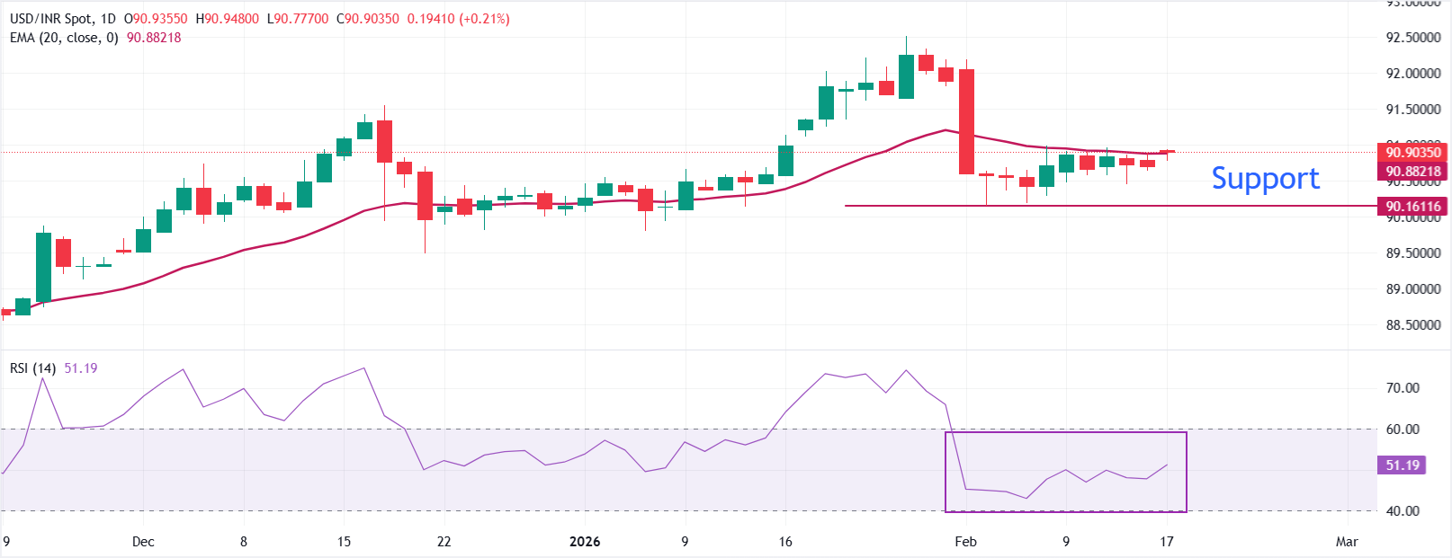 Die indische Rupie (INR) eröffnet am Dienstag flach nahe dem Montagstief bei etwa 90,80 gegenüber dem US-Dollar (USD). Das USD/INR-Paar handelt weitgehend stabil, da die starke Dollar-Nachfrage durch indische Importeure weiterhin den Abwärtstrend unterstützt, während der Aufwärtstrend aufgrund von Befürchtungen über eine Intervention der Reserve Bank of India (RBI) begrenzt bleibt.