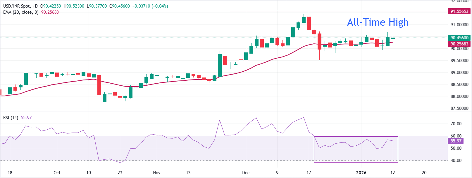 Im Tageschart handelt USD/INR leicht niedriger bei 90,4665. Der Preis hält sich über dem steigenden 20-Exponential Moving Average (EMA) bei 90,2578, was die kurzfristige Tendenz nach oben verzerrt, während der Durchschnitt steigt.
