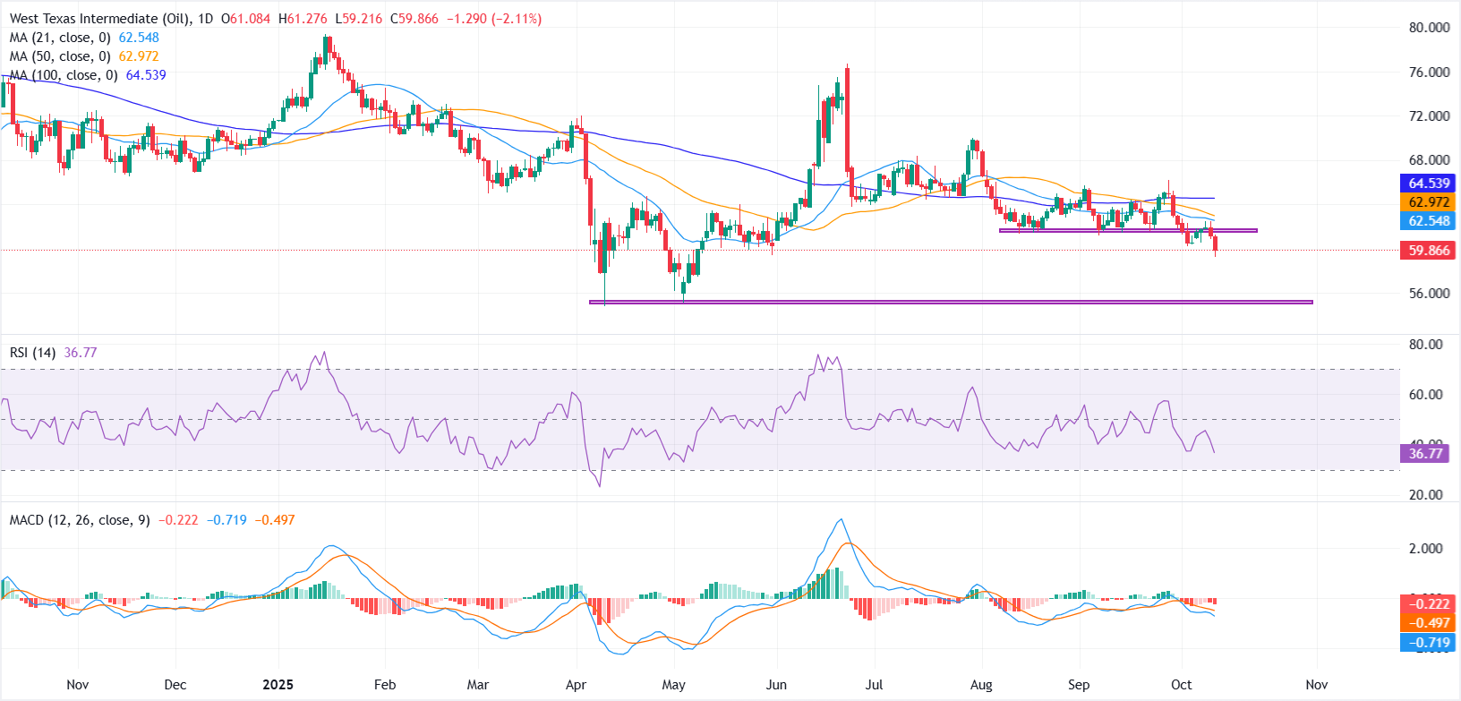 Aus technischer Sicht bleibt die Tendenz klar rückläufig. Die Preise halten sich unter den 21-, 50- und 100-Tage-Simple Moving Averages (SMAs), die sich nun im Bereich von 62,50 bis 64,50 USD gruppieren und eine Obergrenze für kurzfristige Erholungen verstärken. Der Relative Strength Index (RSI) schwebt bei etwa 35, was darauf hindeutet, dass das rückläufige Momentum stark, aber noch nicht überverkauft ist, was Raum für weitere Rückgänge lässt.