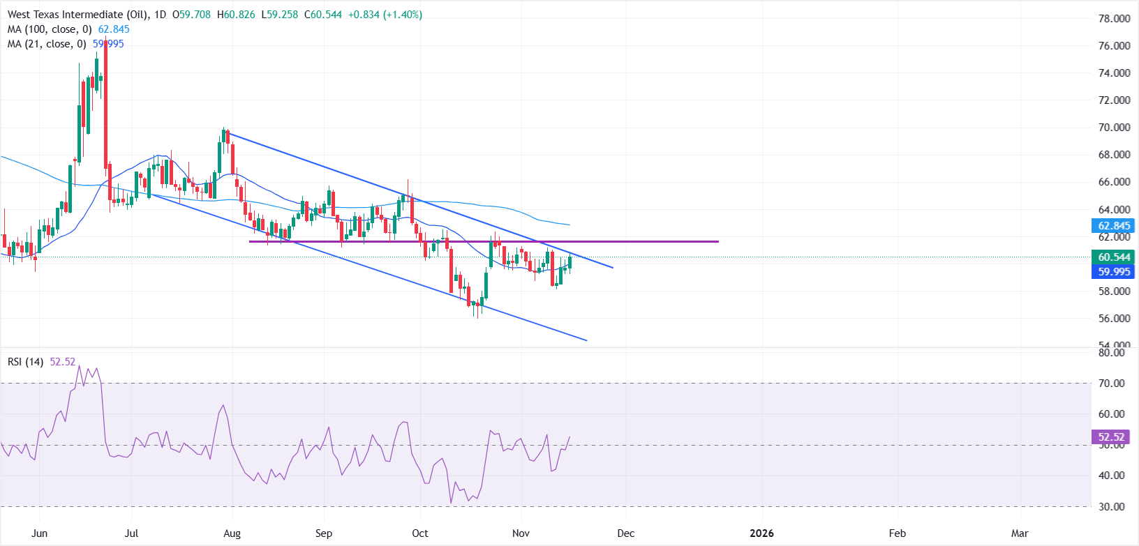 Aus technischer Sicht handelt WTI weiterhin innerhalb eines gut definierten absteigenden Kanals auf dem Tages-Chart. Der breitere Trend bleibt nach unten geneigt, solange die obere Begrenzung des Kanals intakt bleibt. Die Preise haben nun den 21-Tage-Simple Moving Average (SMA) bei etwa 59,97 USD überschritten, was eine leichte Verbesserung des kurzfristigen Momentums bietet.