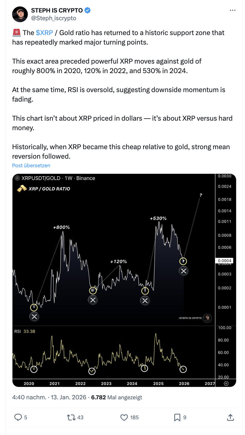 In der Vergangenheit war genau dieses Preisniveau der Startpunkt für außergewöhnliche Bewegungen. Nach dem Erreichen dieser Zone legte XRP gegen Gold um rund 800 % im Jahr 2020 zu, um etwa 120 % im Jahr 2022 und um rund 530 % im Jahr 2024. Jedes Mal folgte eine deutliche Gegenbewegung, nachdem XRP relativ zu Gold „zu billig“ geworden war.